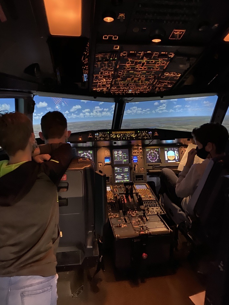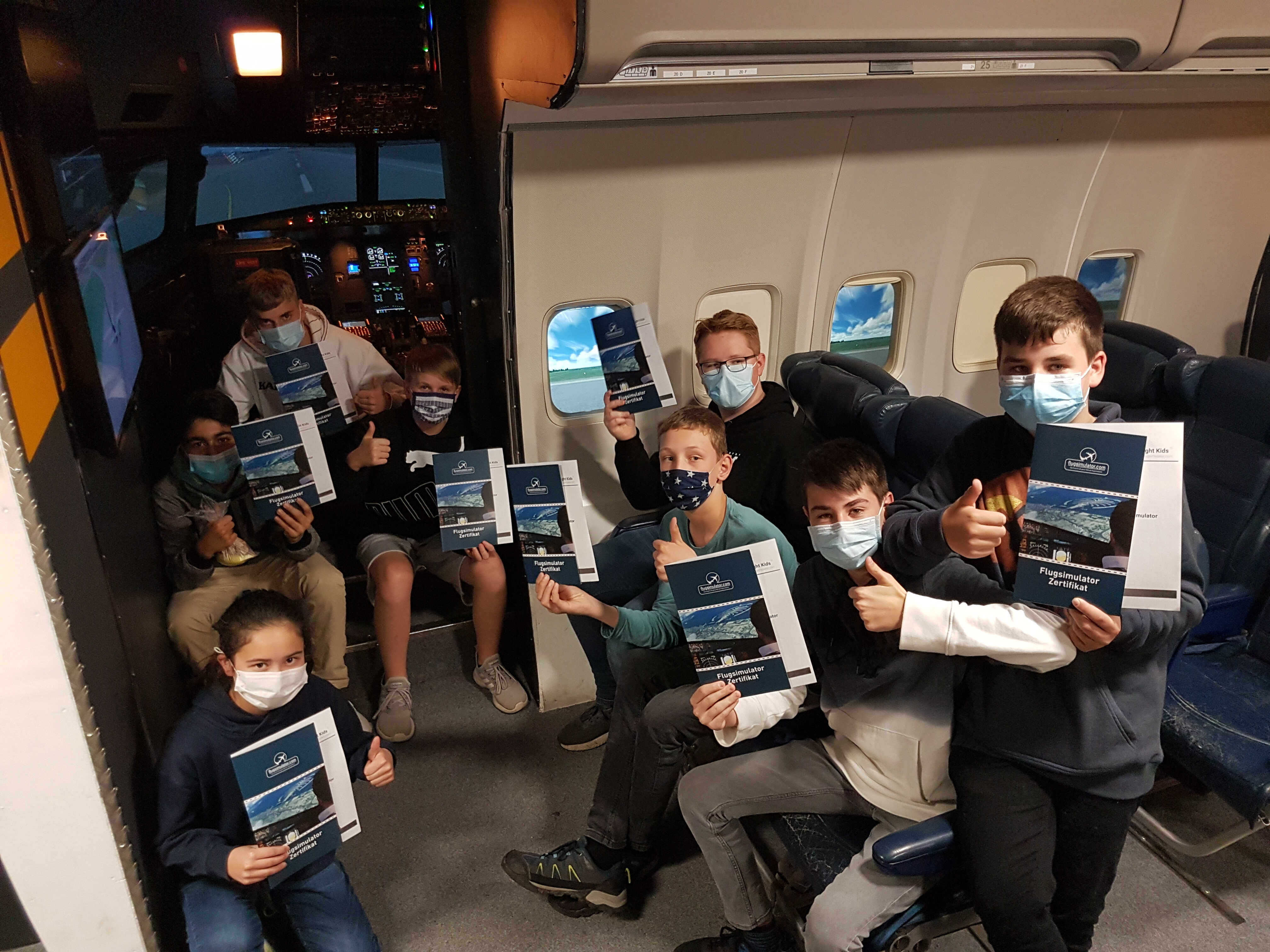 Neun Jugendliche im Alter zwischen 12 und 15 Jahren lernten die Grundlagen der Fliegerei kennen und konnten in einem Simulator mit originalem Cockpit selbst das Steuer einer großen Passagiermaschine übernehmen - geleitet von zwei Piloten! Die Bilder sprechen für sich.